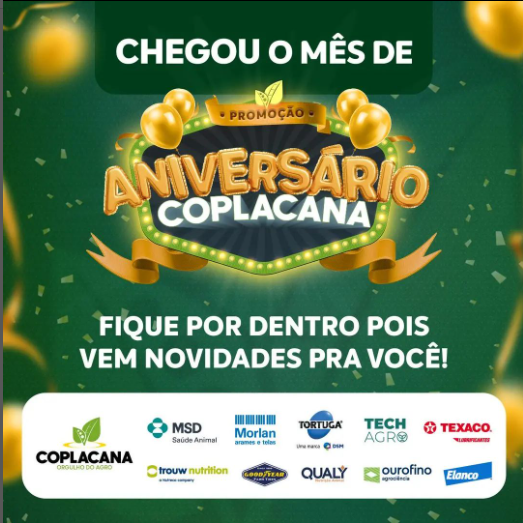 Com esta ideia, a Coplacana promove, até 31 de outubro, uma promoção de aniversário. Produtos da linha varejo, implementos e Massey Ferguson, como óleos, lubrificantes, graxa e pneus para carros, caminhões e máquinas; saúde animal (pequeno e grande portes); suplemento mineral; motobombas; lavadoras de alta pressão e arames, estão com descontos imperdíveis. Muitos outros atrativos também fazem parte da campanha.