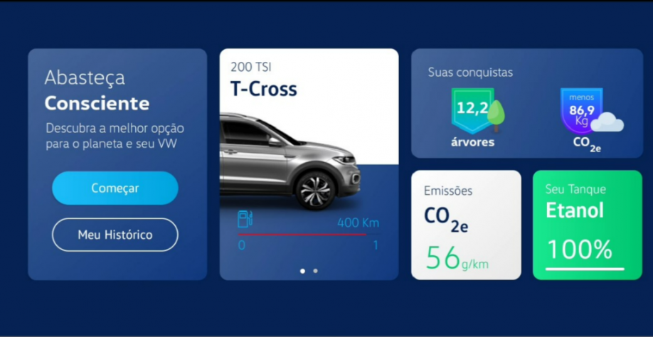 Segundo a montadora, a frota VW composta por carros flex fuel – tecnologia desenvolvida e lançada de forma pioneira pela Volkswagen em 2003 – chega a 96%, e o interesse por parte do público em abastecer de forma mais consciente foi comprovado pelo número simulações da calculadora Abasteça Consciente, que, em um ano, chegou a um milhão.