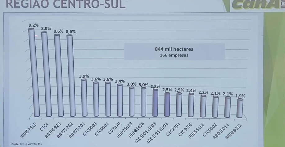 No Centro-Sul, a variedade da Ridesa (RB867515) segue como o material com maior intenção de plantio, com 9,2% de participação; seguida pela CTC4 (8,9%), RB966928 (8,6%) e RB975242 (8,6%).