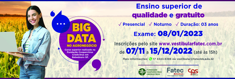 O curso de Tecnólogo em Big Data no Agronegócio da FATEC de Bebedouro (SP) está com inscrições abertas para o processo seletivo. uma realização As inscrições devem ser feitas pelo site da Fatec Link até dia 15 de dezembro. O exame acontece no dia 8 de janeiro. O curso é uma parceria entre a Fundação Coopercitrus Credicitrus e o Centro Paula Souza.