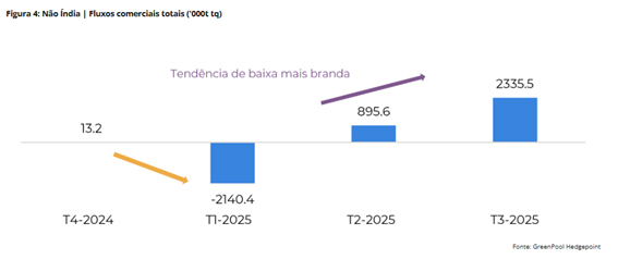 “Foram produzidos 710Kt em comparação com 1,27Mt do ano passado. As exportações indianas devem ser limitadas até a reposição de estoques, impactando os fluxos comerciais globais”, aponta Lívea.