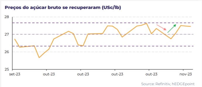 - Os preços do açúcar bruto sofreram correções, mas voltaram ao nível próximo a 27,5 USc/lb após a estimativa da ISMA de 33,7Mt para a safra 23/24 da Índia, indicando um declínio em relação à temporada anterior.