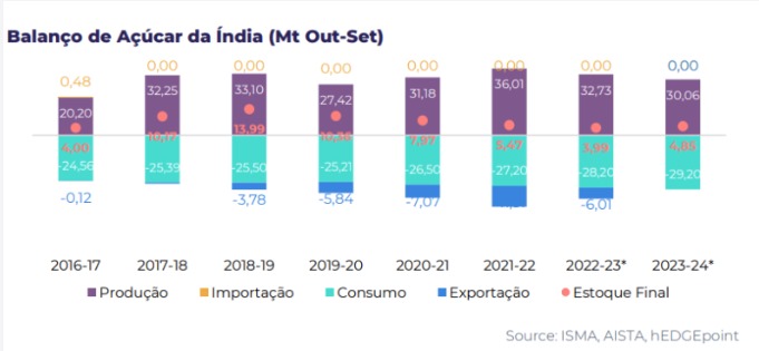 - A Índia poderia produzir cerca de 30Mt de açúcar considerando o desvio para etanol, sugerindo um equilíbrio positivo entre produção e consumo em 23/24.