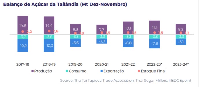 - A produção de açúcar da Tailândia deverá reduzir para 7-8Mt em 23/24, levando a preocupações sobre a participação do país no mercado global.