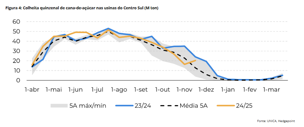 Além disso, o relatório da Unica indicou uma moagem acumulada surpreendente que ultrapassou os 600Mt para a safra 24/25 no Centro-Sul. "Diante dos resultados, revisamos nossas estimativas de 610Mt para 616,5Mt", destaca Lívea. A analista ressalta, ainda, que os números podem indicar um pessimismo excessivo do mercado, que prevê uma média de 590Mt para 25/26.