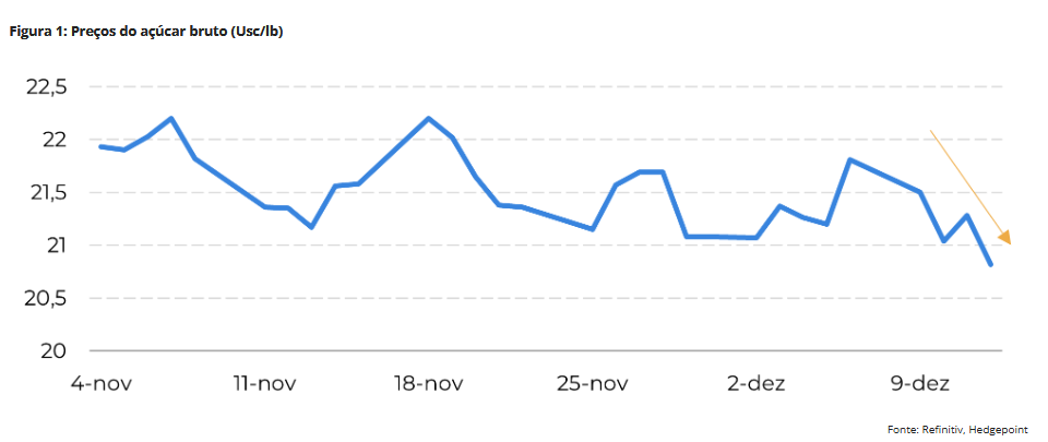 Na semana passada, os preços do açúcar caíram devido a fatores diversos. "A Tailândia iniciou sua moagem em dezembro, com resultados positivos: produção de 193kt de açúcar, a partir de 2,7Mt de cana, produtividade superior à do ciclo anterior, de 23/24", observa Lívea Coda, analista de Açúcar e Etanol da Hedgepoint Global Markets.