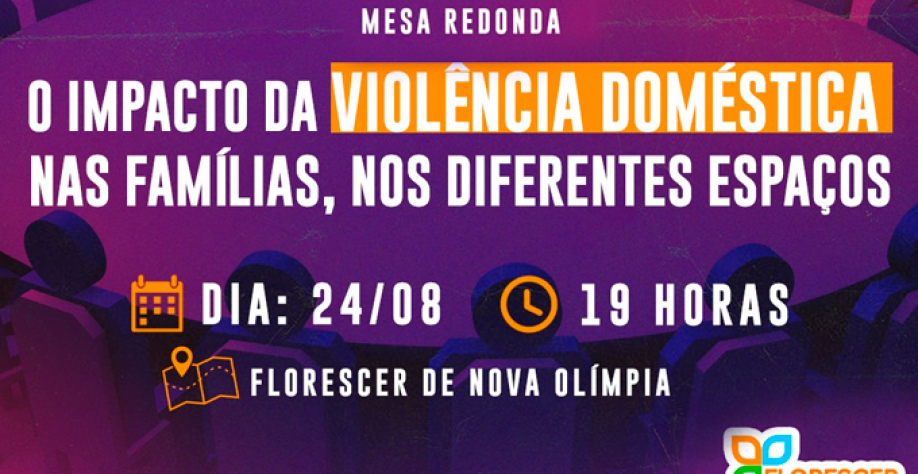Em alusão à campanha "Agosto Lilás", a Florescer Ação Social reúne convidados e promove debates sobre violência doméstica nas famílias. O primeiro deles ocorre nesta quinta-feira (24), às 19h, na unidade da organização em Nova Olímpia (MT), localizada na Avendia Olacyr de Moraes, 97s.