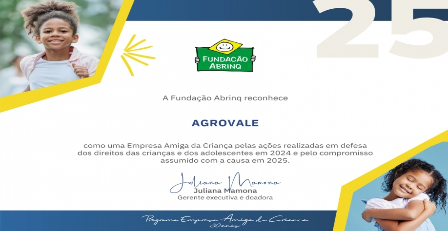 A Agrovale teve mais uma vez reconhecido seu compromisso com a infância e a adolescência. A empresa recebeu da Fundação Abrinq a renovação do Selo Empresa Amiga da Criança, destacando as ações realizadas em 2024 e o compromisso assumido com a causa para 2025.