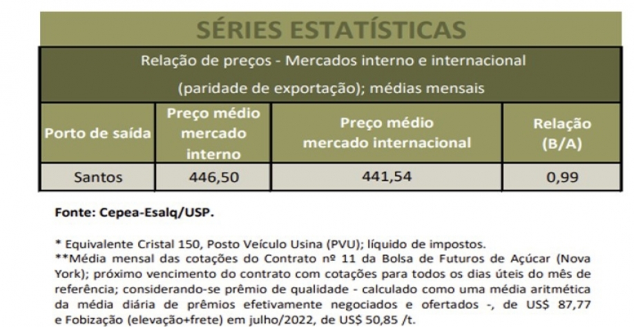 Esse cenário esteve atrelado aos recuos do dólar e da cotação do açúcar demerara na Bolsa de Nova York (ICE Futures). Cálculos do Cepea indicaram que, em julho/2022, as vendas internas do açúcar remuneraram, em média, 1,12% a mais que as externas. Esse cálculo considera o valor médio do Indicador CEPEA/ESALQ e do vencimento Outubro/22 do contrato nº 11 da ICE Futures, prêmio de qualidade estimado em US$ 87,77/tonelada e custos com elevação e frete de US$ 50,85/tonelada.