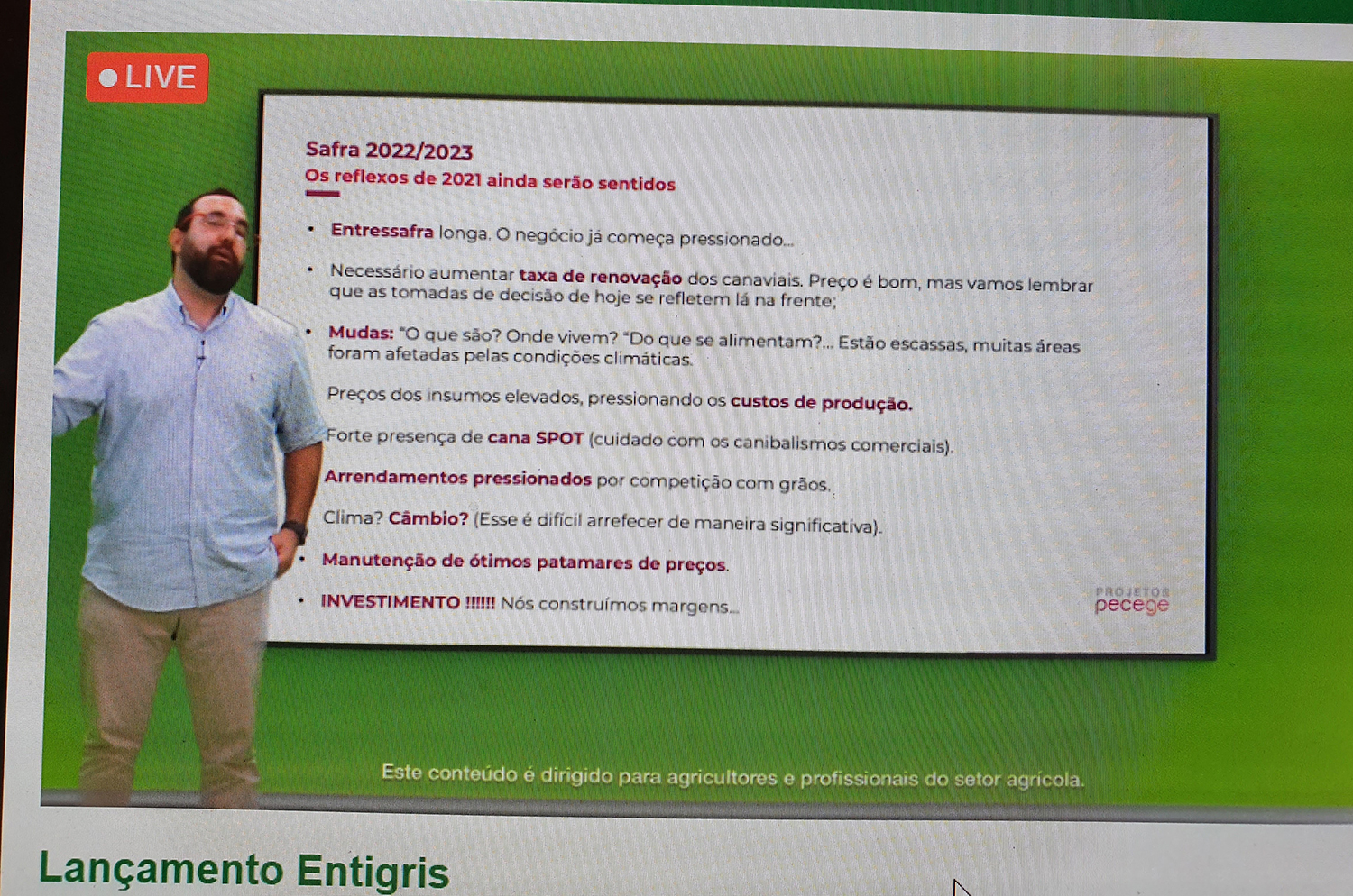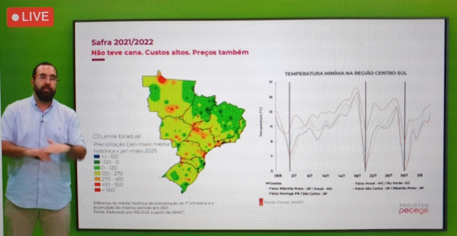 Em palestra durante lançamento do inseticida Entigris, desenvolvido pela BASF para controle de cigarrinha das raízes em cana, ocorrido na última quinta-feira, 21, João Rosa (Botão) gestor de projetos do Pecege, apresentou a análise dos especialistas do Pecege sobre a safra canavieira 2021/22 da região Centro-Sul do Brasil.