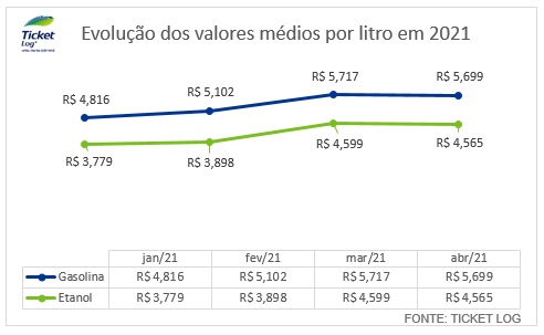 "O recuo nos preços em abril interrompe uma sequência de dez aumentos consecutivos registrados pela Ticket Log. Ainda assim, quando comparados aos preços médios de maio de 2020, data da última redução, a gasolina está 42,30% mais cara, e o etanol, 42,39% acima", pontua Douglas Pina, Head de Mercado Urbano da Edenred Brasil.