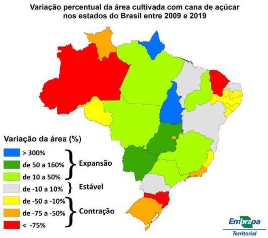 O crescimento da área cultivada com cana-de-açúcar no Brasil foi de 14,3% entre os anos de 2009 e 2019. Nesse período, as áreas de cultivo se deslocaram para estados do Centro-Oeste e se concentraram em um número menor de microrregiões.