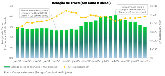 Como evidenciado no segundo gráfico, em que as barras verdes representam a Relação de Troca – estipulando quantas toneladas de cana seriam necessárias para comprar 100 litros de diesel –, o melhor momento para a compra do insumo se deu em meados de setembro de 2021, quando os preços mais baixos do combustível respondiam à baixa demanda mundial devido à pandemia e o setor ostentava maior retorno pela matéria-prima, em meio à quebra da safra e aos altos preços das commodities mundiais. Em contrapartida, o momento menos favorável se deu um ano depois, em setembro de 2022, tendo em vista os acontecimentos no Leste europeu e a reabertura econômica, que fizeram com que os preços do carburante escalassem.