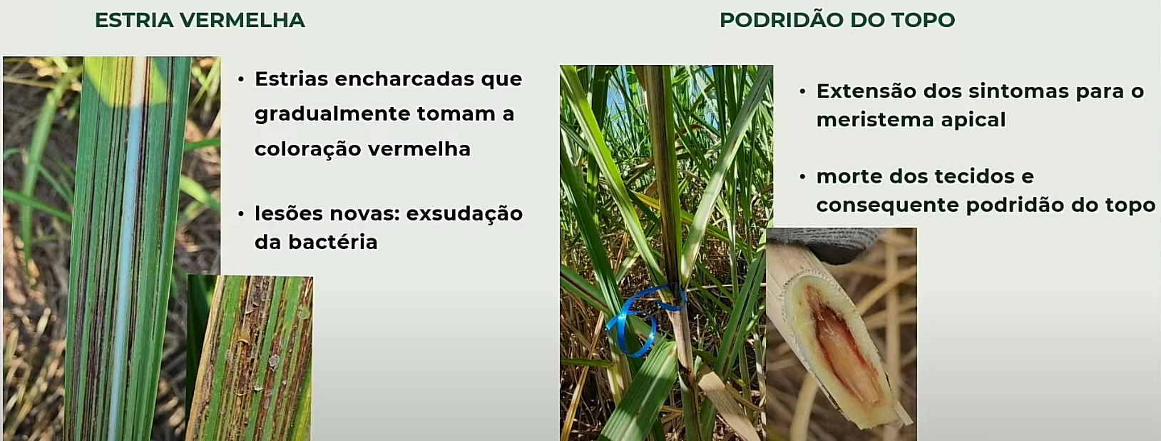 No campo, a pesquisadora afirma que é possível identificar a doença de duas formas. Nas folhas, surgem estrias encharcadas que gradualmente tomam a coloração avermelhada, se concentrando geralmente no terço médio para a base, podendo inclusive atingir o meristema apical, fato que desencadeará o segundo sintoma: a podridão do topo.