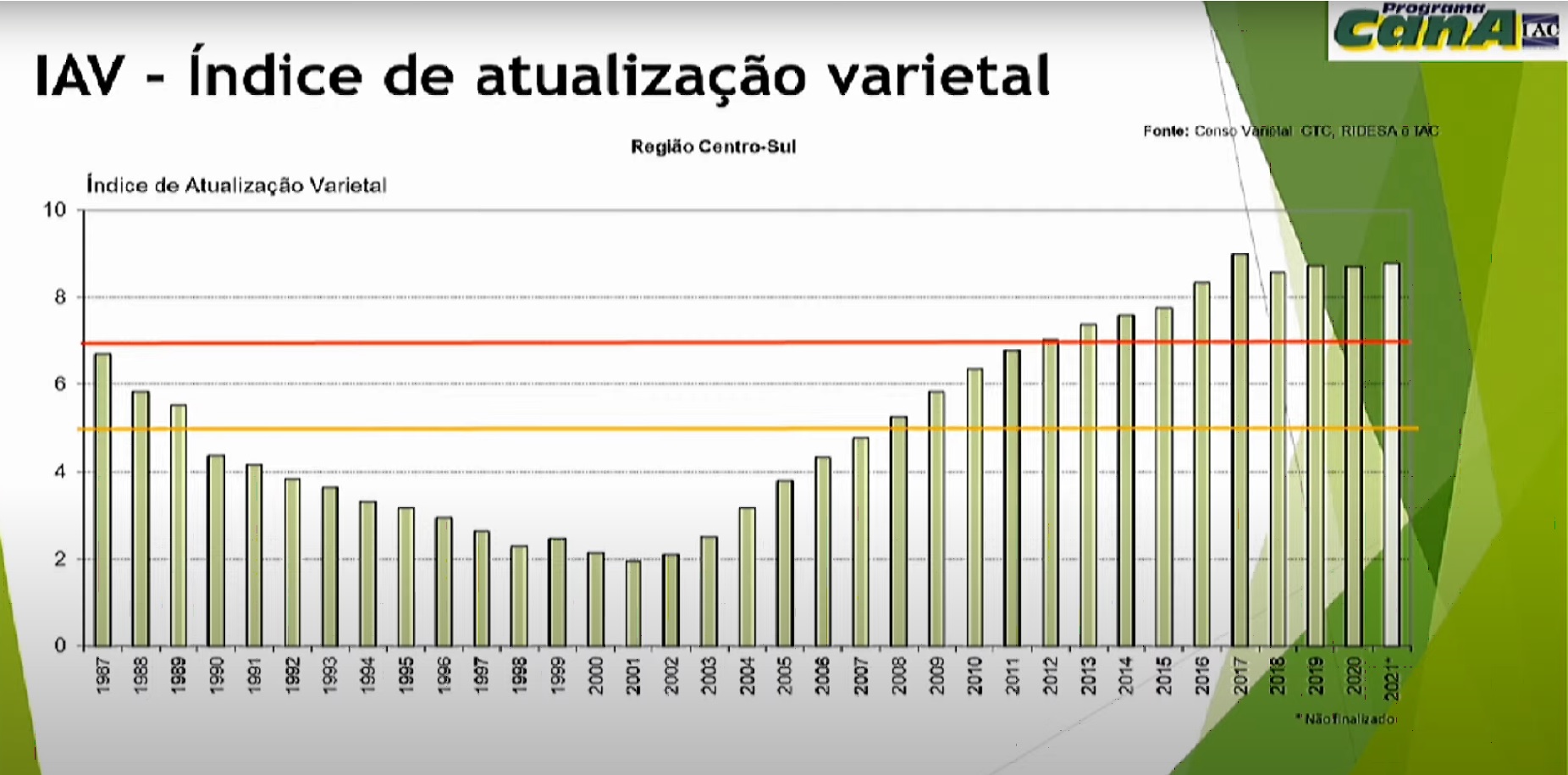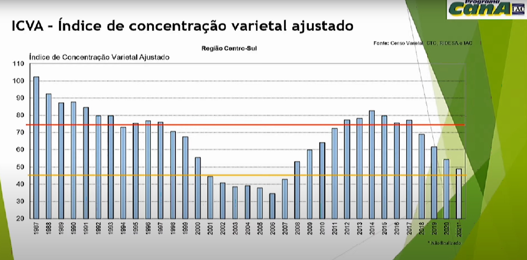Na última terça-feira (23), o Centro de Cana do Instituto Agronômico (IAC) realizou a 7ª Reunião do Grupo Fitotécnico de Cana de 2021. Além de divulgar os resultados do Censo Varietal Safra 2021/22 do Centro-Sul do país, o pesquisador e coordenador do projeto, Rubens Leite do Canto Braga Júnior, apresentou alguns índices de qualidade gerados a partir desse trabalho.