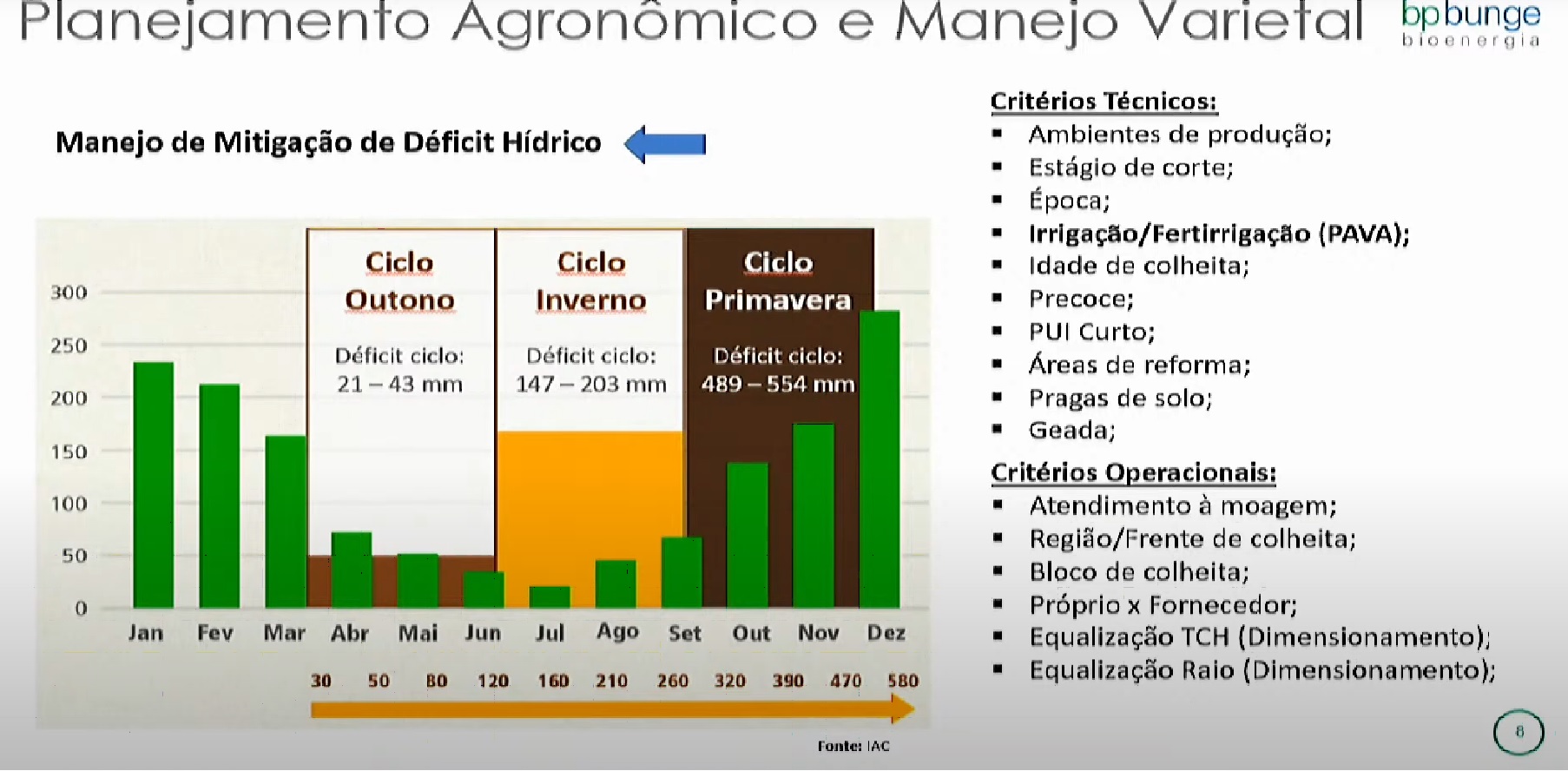 Na última terça-feira (22), o gerente de fitotecnia corporativa da empresa, Thiago de Paula e Silva, forneceu detalhes desse planejamento durante apresentação no 1ª Reunião do Grupo Fitotécnico de Cana de 2022. Chamado de “manejo de mitigação de déficit hídrico”, o projeto busca minimizar a exposição dos canaviais ao déficit hídrico seguindo alguns critérios técnicos e operacionais.