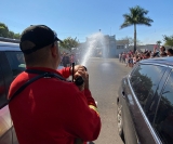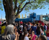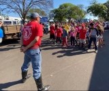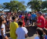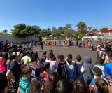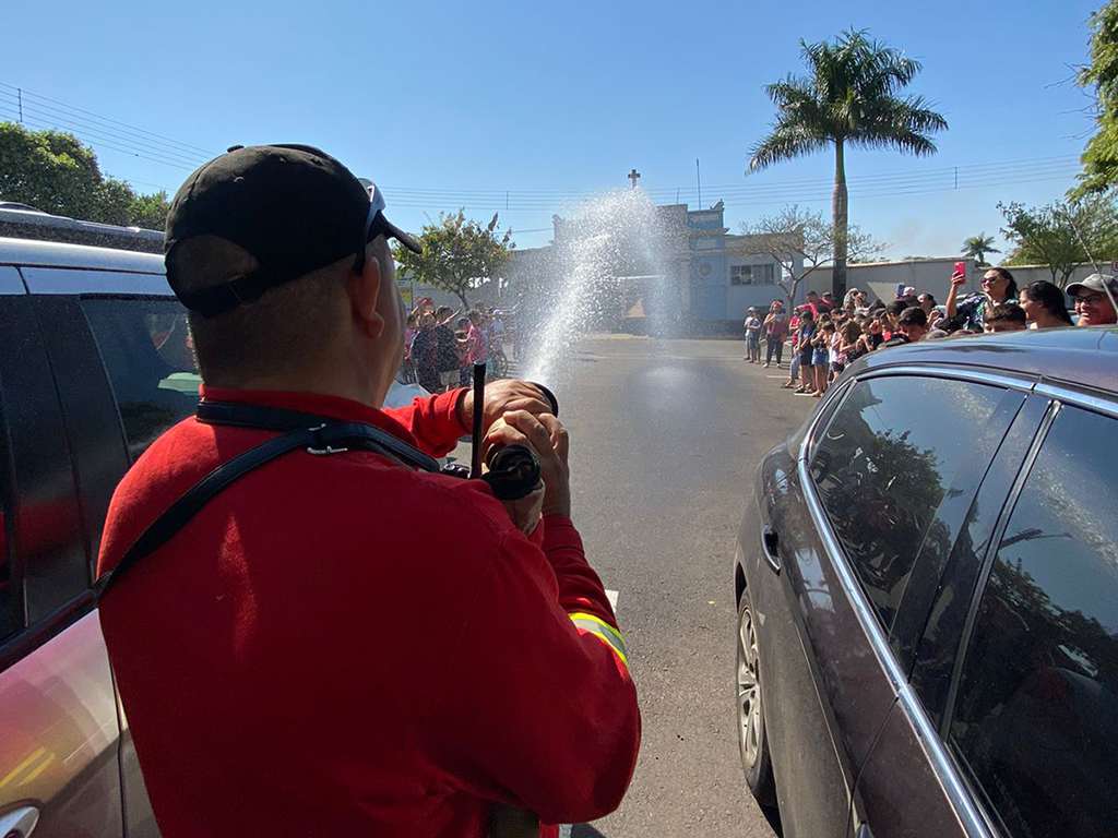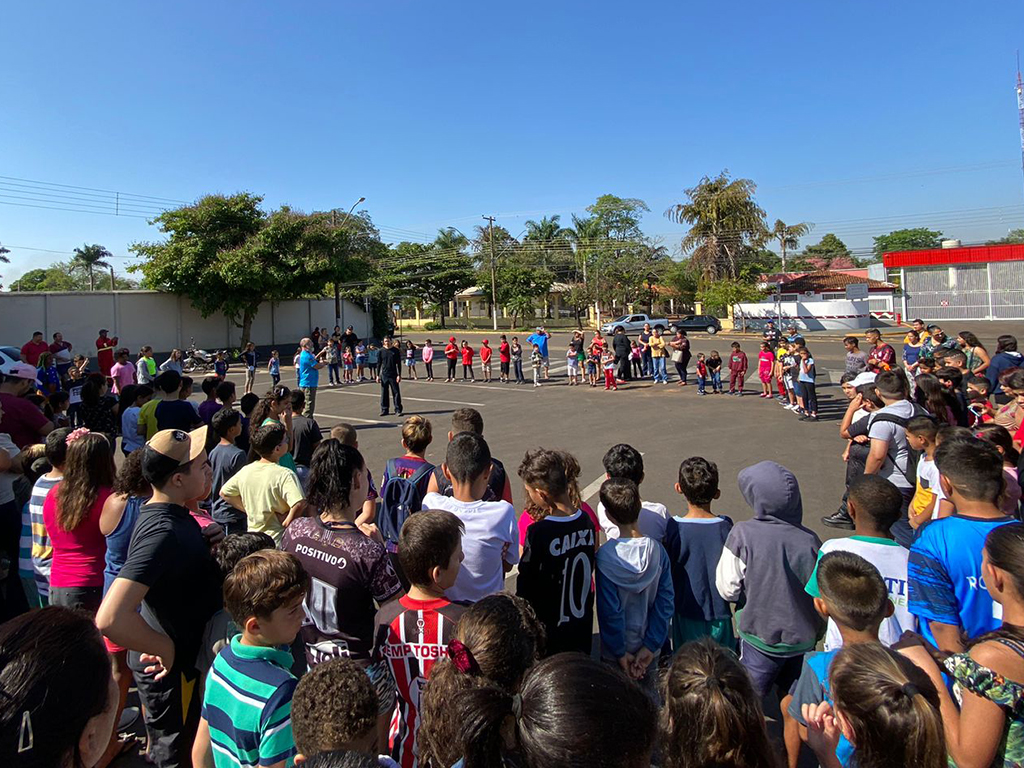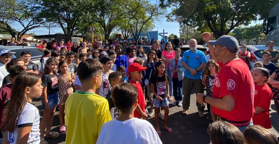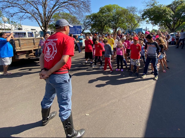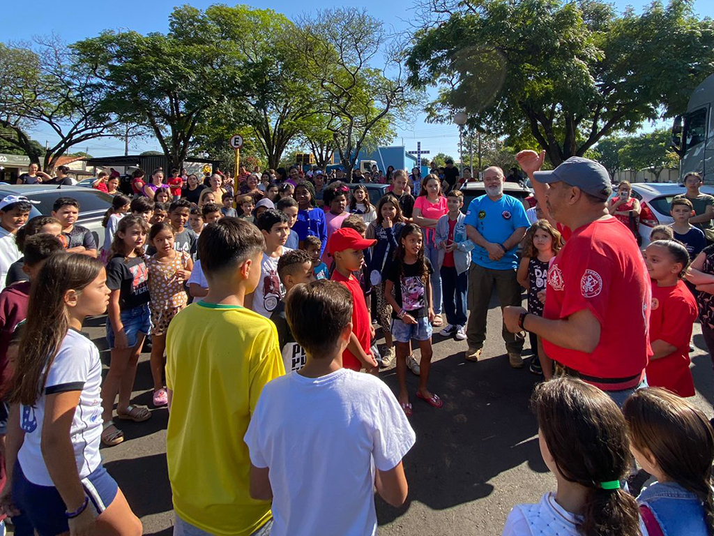 Alunos e seus pais puderam acompanhar a apresentação feita numa praça da cidade, onde os brigadistas Valdir Simão da Cruz e Marcelo do Carmo, junto com Israel, demonstraram as ações de combate e prevenção a incêndios.