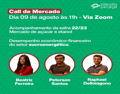 Call de Mercado - analistas do Pecege apresentarão as análises do mercado sucroenergético brasileiro e o andamento da safra 22/23