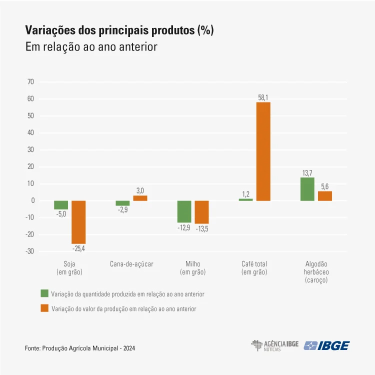 Segundo o IBGE, devido à safra recorde de 2023 e aos elevados estoques, as cotações da commodity permaneceram em patamares considerados baixos ao longo de 2024.