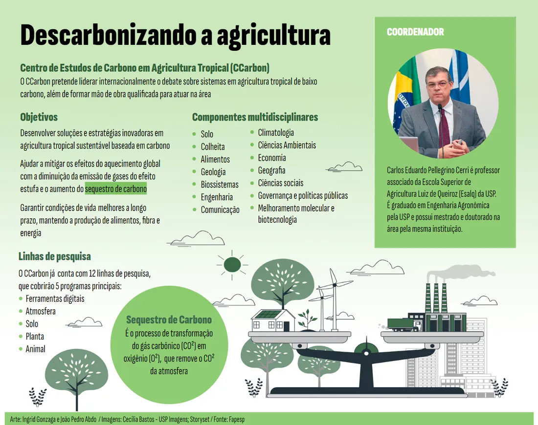 “O objetivo do novo centro é prover soluções inovadoras e sustentáveis para que o Brasil continue produzindo alimentos, fibra e energia, mas com uma menor emissão de gases do efeito estufa e maior sequestro de carbono.” Essa frase é do professor Carlos Eduardo Cerri, coordenador do Centro de Estudos de Carbono em Agricultura Tropical (Ccarbon), um dos quatro novos centros criados no início de março pela Reitoria da USP. Os outros três são: Centro de Estudos e Tecnologias Convergentes para Oncologia de Precisão, Centro de Estudos Amazônia Sustentável e Centro de Agricultura Tropical Sustentável, todos com a proposta de trabalho interdisciplinar e transdisciplinar em temas relevantes para a sociedade.