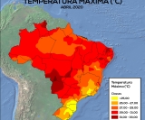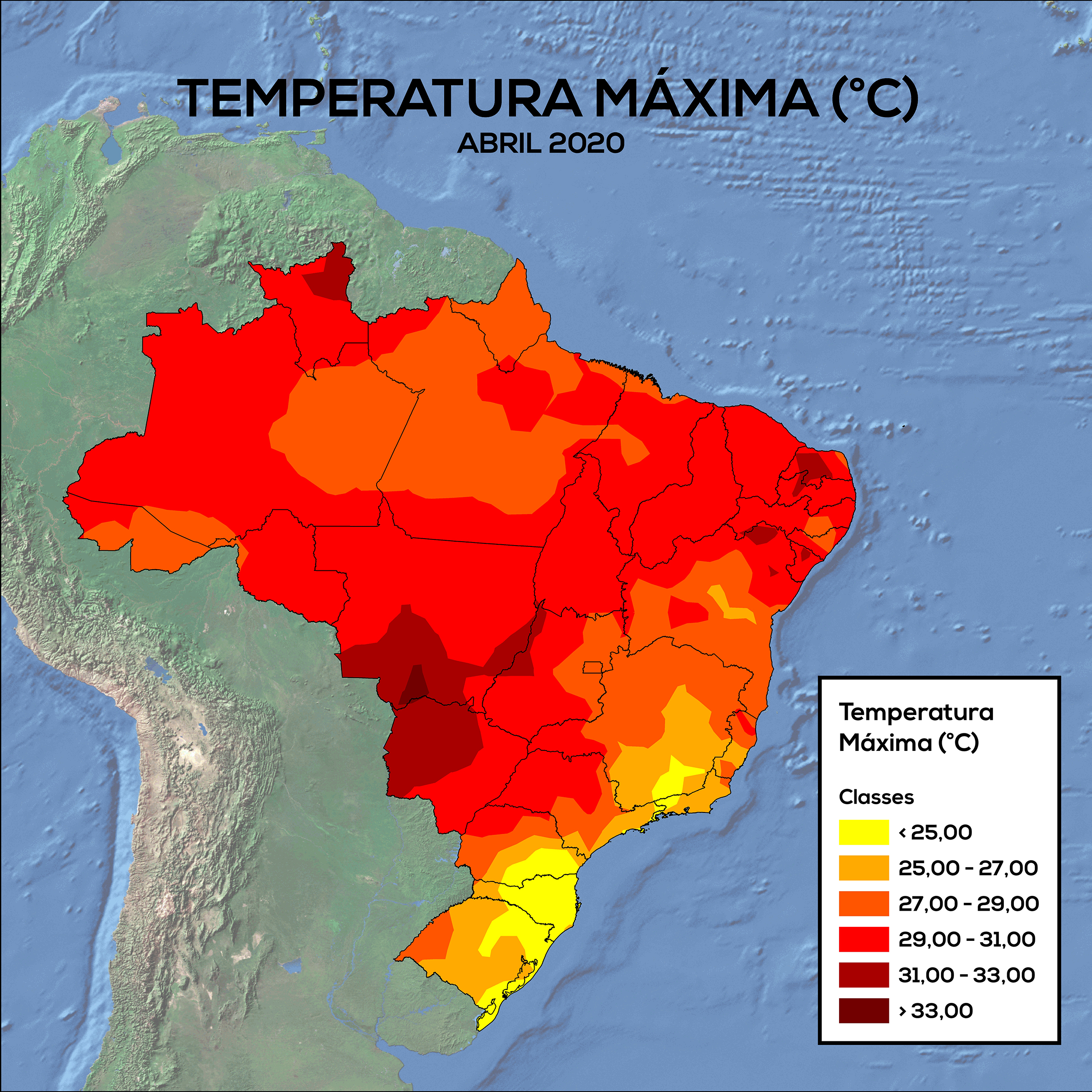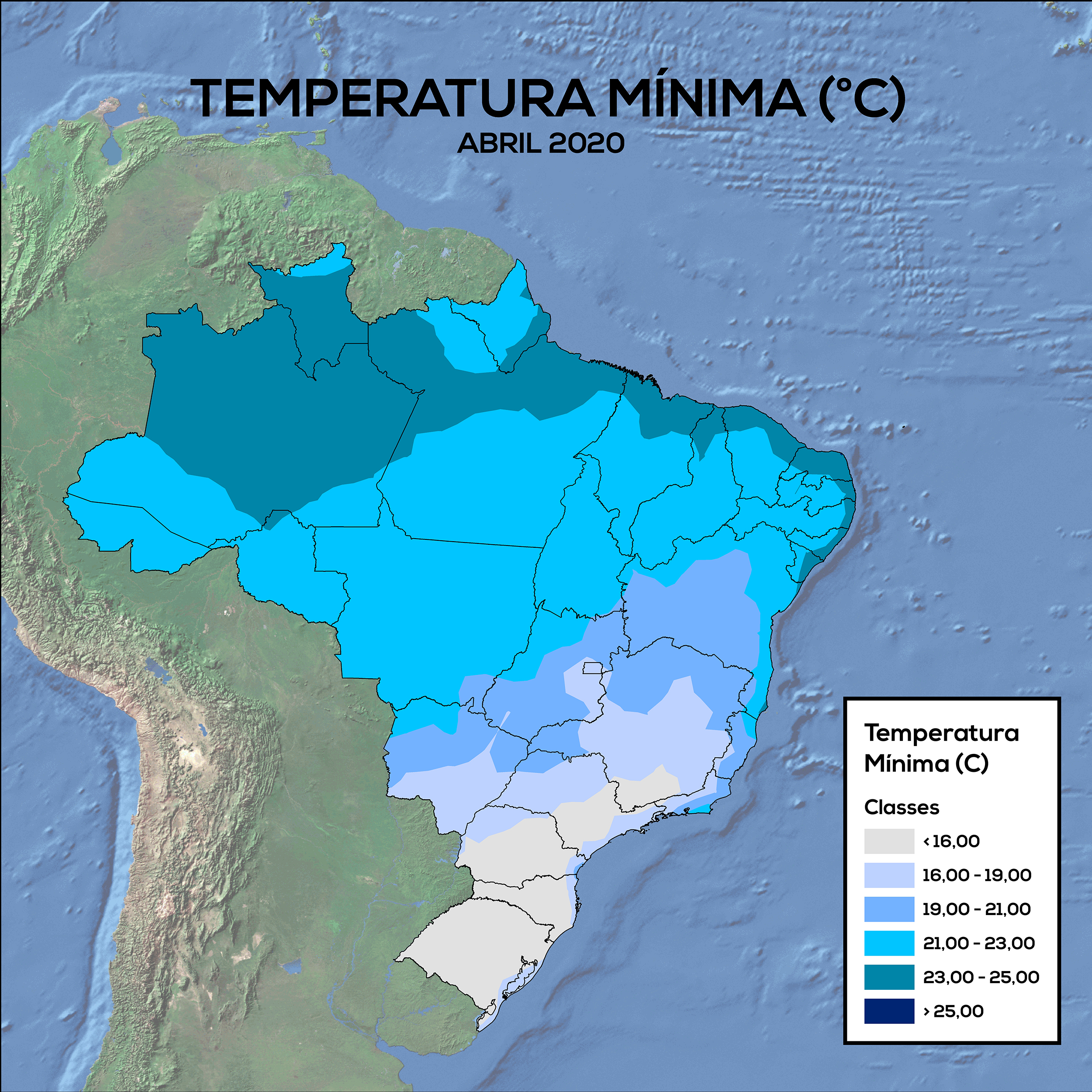Para o Centro-Sul do Brasil, o armazenamento hídrico no solo já está abaixo de 30%, com exceção do norte de Minas Gerais, Mato Grosso, Goiás, sul do Rio de Janeiro (Mapa 2). As temperaturas máximas oscilaram em torno de 25 e 33°C no CentroSsul e atingiram valores superiores à 33°C no sul do Mato Grosso. As temperaturas mínimas foram superiores na região norte e nordeste, alcançando valores no intervalo de 23 a 25 °C. Contudo, algumas partes regiões sul e sudeste do país atingiram valores de temperaturas mínima inferiores à 16°C (Mapas 3 e 4).