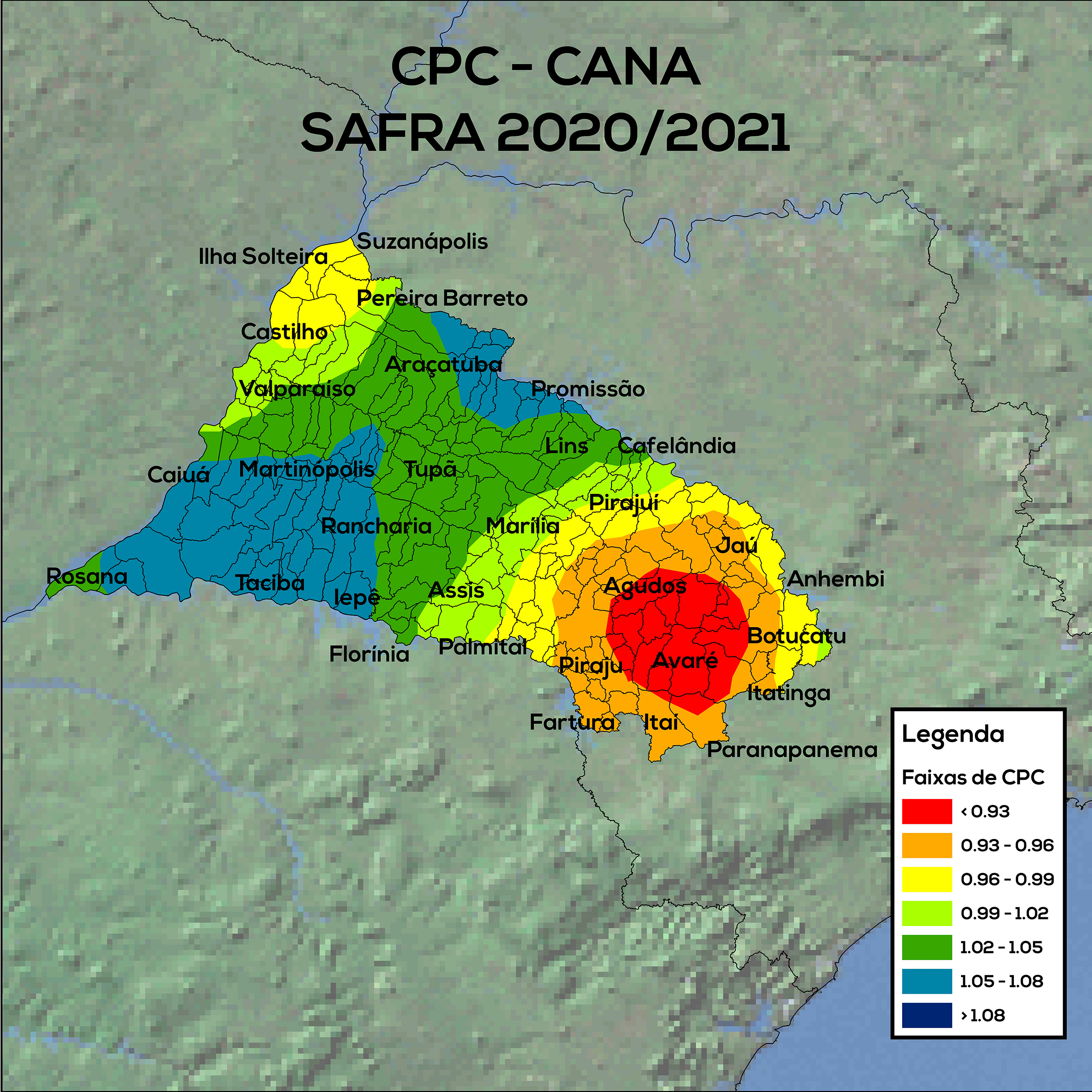 As projeções geradas pelo Sistema TEMPOCAMPO para a safra 2020/21 de cana-de-açúcar indicam um contraste dentre as regiões do centro-oeste paulista. O CPC (Coeficiente de Produtividade Climática do Sistema TEMPOCAMPO) indicou perdas superiores à 7% à ganhos de até 8% nas lavouras.
