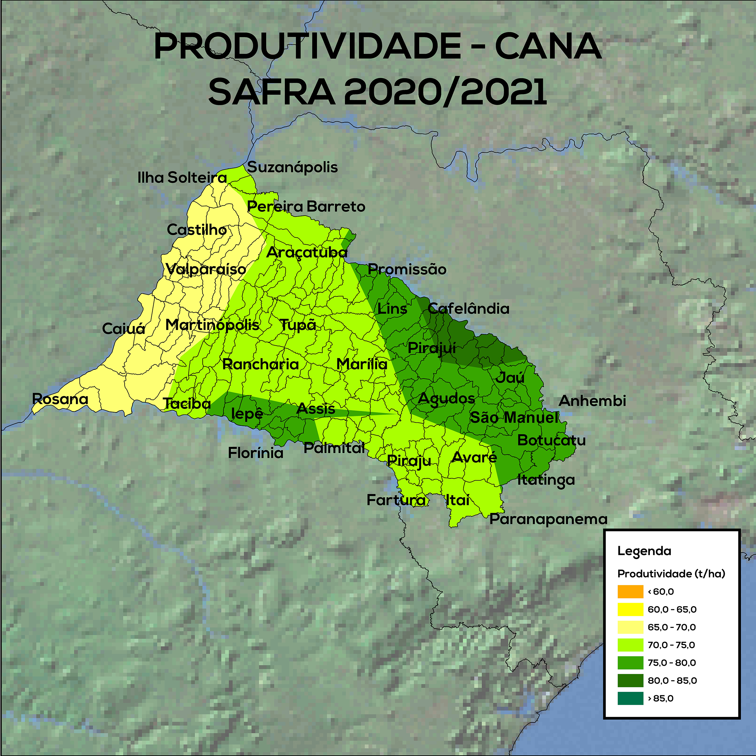 A produção projetada para a safra 2020/21 deverá ser de 118,06 milhões de toneladas, em torno de 2% maior que a safra 2019/20. Ainda, o Sistema TEMPOCAMPO projeta uma produtividade média para o centro-oeste do Estado de São Paulo de 78,9 t/ha. Com destaque para as regiões de Cafelândia e Pirajuí, na quais são esperadas produtividade maiores que 85 t/ha. Na região central, a produtividade média oscila entre 70,0 a 75,0 t/ha. Entretanto, menores produtividades são esperadas em torno das regiões de Rosana, Valparaíso e Ilha Solteira, variando no intervalo de 65,0 a 70,0 t/ha (Mapa 6). Contudo, se a estiagem se manter durante ao longo do mês de maio, a produtividade pode ser afetada, notadamente para os canaviais a serem colhidos no final da safra.