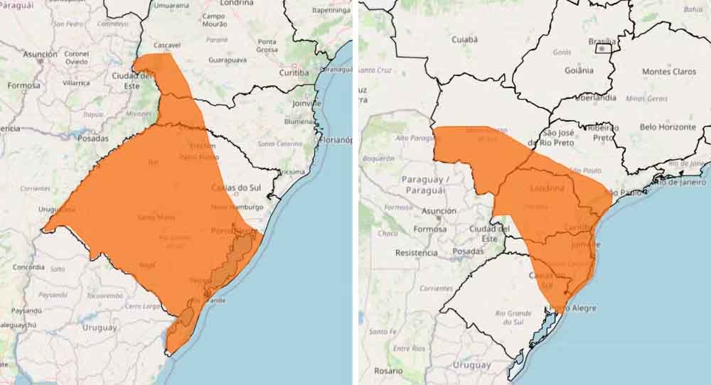 Dois alertas laranja, que significam “perigo para tempestades”, estão ativos. O primeiro, com vigência até 23h de quinta-feira, abrange o sudoeste, noroeste, sudeste, nordeste, centro-oriental e centro-ocidental do Rio Grande do Sul, além da região metropolitana de Porto Alegre; o oeste de Santa Catarina; e o sudoeste, oeste e centro-sul do Paraná.