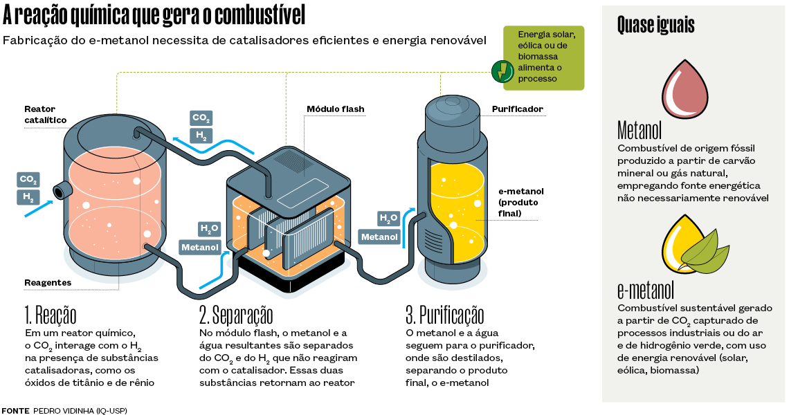 Uma das iniciativas foi concebida no Instituto de Química da Universidade de São Paulo (IQ-USP) no âmbito do Centro de Pesquisa para Inovação em Gases de Efeito Estufa (RCGI), uma parceria entre a FAPESP e a empresa energética anglo-holandesa Shell. Seu objetivo é produzir uma versão sustentável do metanol (CH₃OH), conhecida como e-metanol, utilizando energia renovável no processo e CO₂ capturado de usinas de etanol. A meta é empregar o combustível na propulsão de navios, uma aposta do setor marítimo para a transição energética.