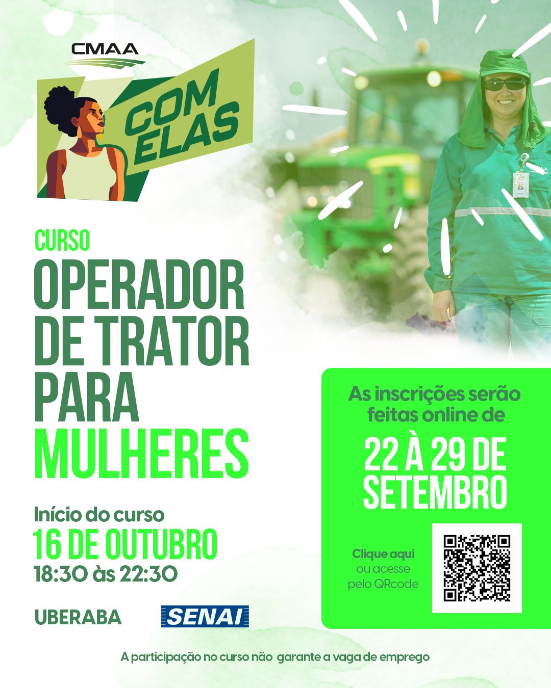 As inscrições iniciam-se hoje, 22, e seguem até 29 de setembro. O curso já tem data pata começar: a partir de 16 de outubro, em Ituiutaba e Uberaba. Este programa de formação, idealizado pela CMAA, é uma demonstração do compromisso da empresa em fortalecer a comunidade e oferecer desenvolvimento pessoal. O curso busca equipar as participantes com habilidades valiosas em operação de tratores, e, também, proporcionar oportunidades de carreira significativas no setor.
