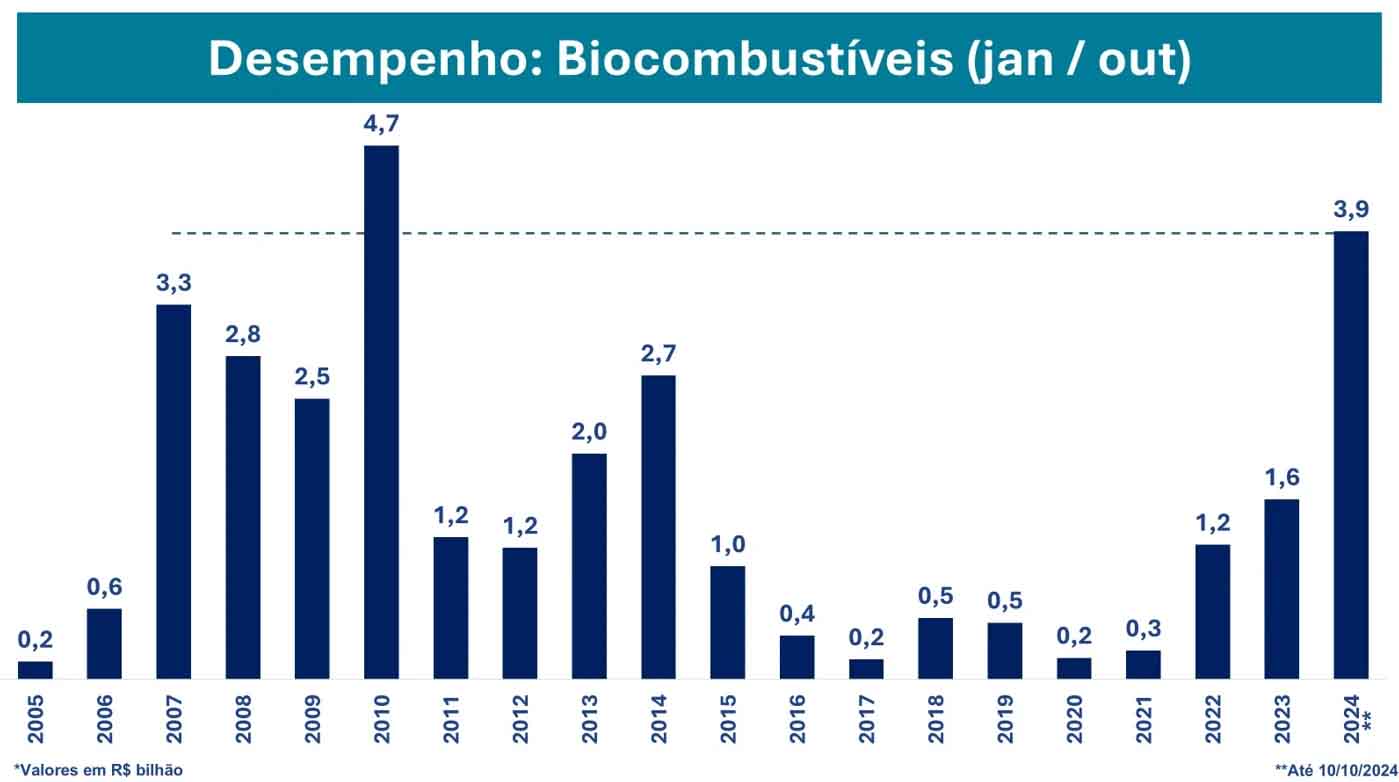 De janeiro a outubro de 2024, as aprovações de crédito do BNDES para o setor de biocombustíveis totalizaram R$ 3,9 bilhões, marcando a segunda maior cifra da série histórica que começou em 2005. O recorde permanece em R$ 4,5 bilhões, registrado em 2010.