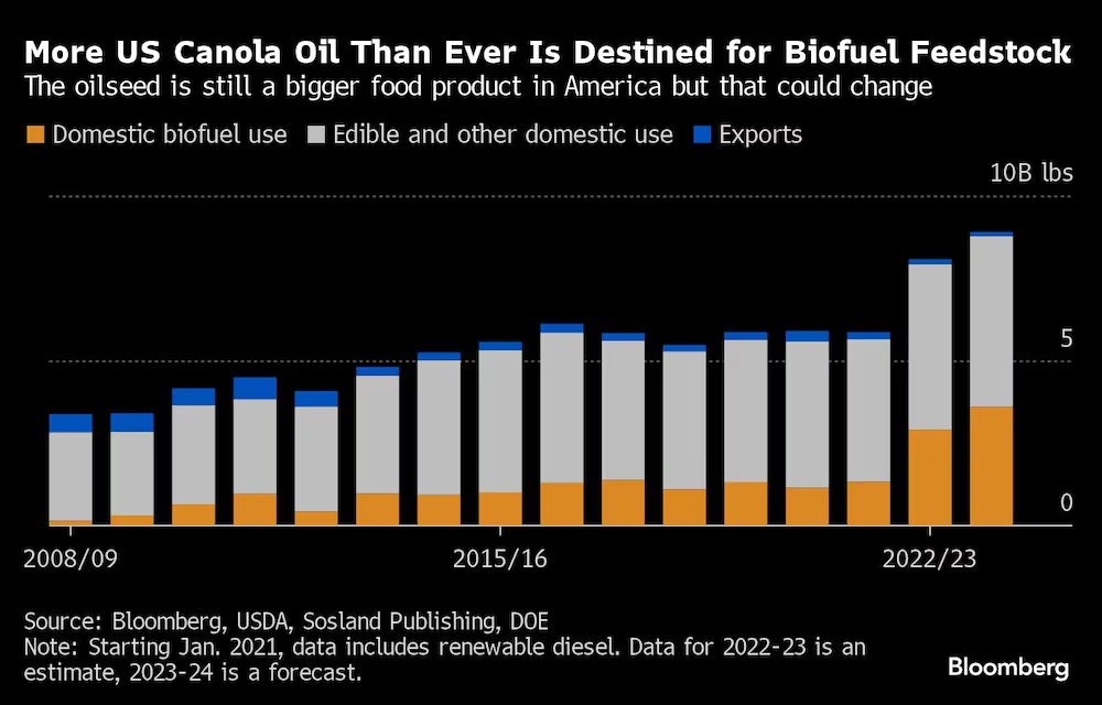 Se a expansão do mercado continuar como planejado, o mercado total dos EUA e do Canadá para óleos, gorduras e graxas usados para produzir biocombustíveis será avaliado em mais de US$ 20 bilhões no próximo ano, de acordo com estimativas do analista da Bloomberg Intelligence, Brett Gibbs. Isso representa um aumento em relação aos cerca de US$ 6 bilhões em 2019.