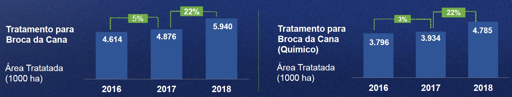 Preocupada com os danos causados, a comunidade sucroenergética tem, ano a ano, aumentado seus investimentos em ferramentas de controle, especialmente no uso de inseticidas. Um levantamento do instituto de pesquisa Spark mostrou que, de 2017 a 2018, houve um aumento de 22% no manejo da broca-de-cana, totalizando quase seis milhões de hectares tratados. Olhando para os químicos de forma isolada, também é notável uma evolução. Em apenas dois anos (2016 a 2018), a área tratada saltou de 3,7 milhões de hectares para 4,7 milhões de hectares.