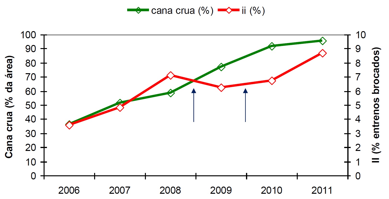 Se observamos os gráficos de evolução da colheita mecanizada no Estado de São Paulo e compará-los os índices de infestação da broca ao longo dos anos fica claro que a falta de fogo beneficiou demasiadamente a praga. Conforme a mecanização da colheita avançava, a incidência de broca seguia no mesmo patamar, aumentando não somente em área, mas também em danos, que não já eram restritos apenas aos canaviais mais jovens.