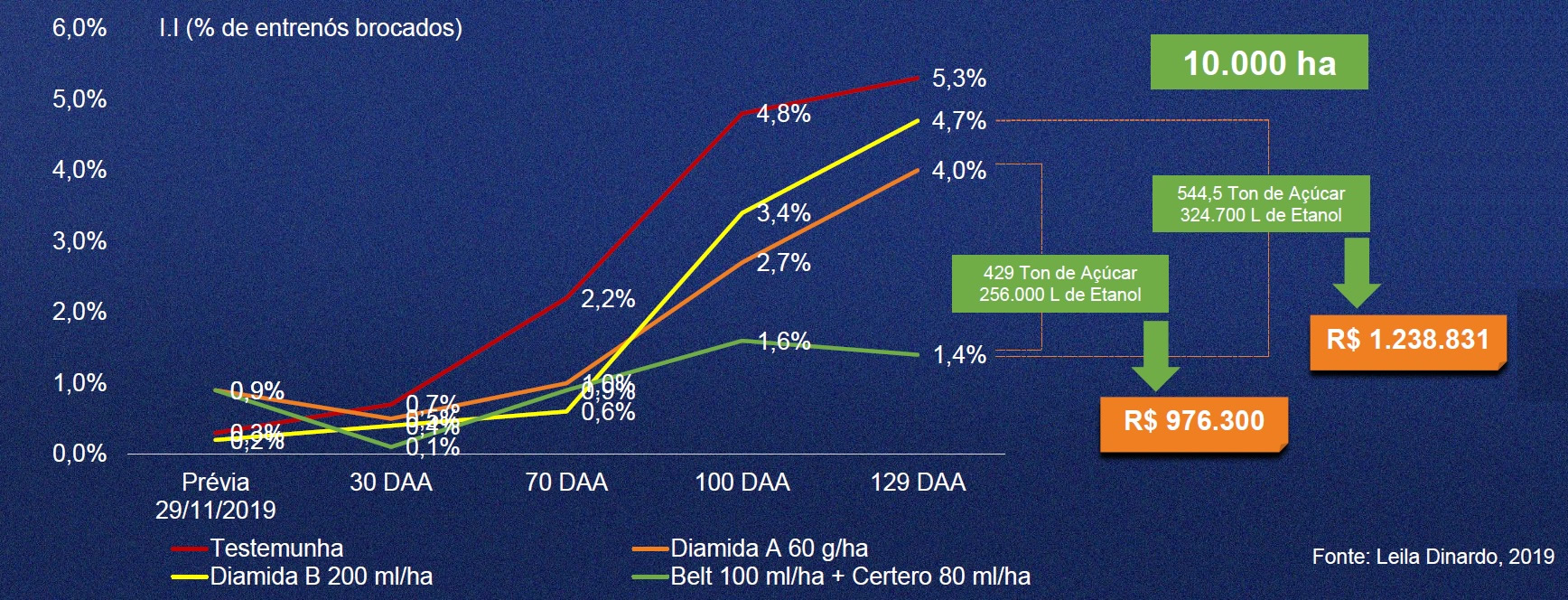 Extrapolado os dados para uma área de 10 mil hectares, a solução da Bayer evitaria a perda de 429 toneladas de açúcar e 256 mil litros de etanol em comparação com a Diamida A, totalizando um ganho de R$ 976,3 mil por safra. Já na comparação com a Diamida B, seriam evitadas perdas de 544,5 toneladas de açúcar e 324 mil litros de etanol, totalizando mais de R$ 1,3 milhão por safra.