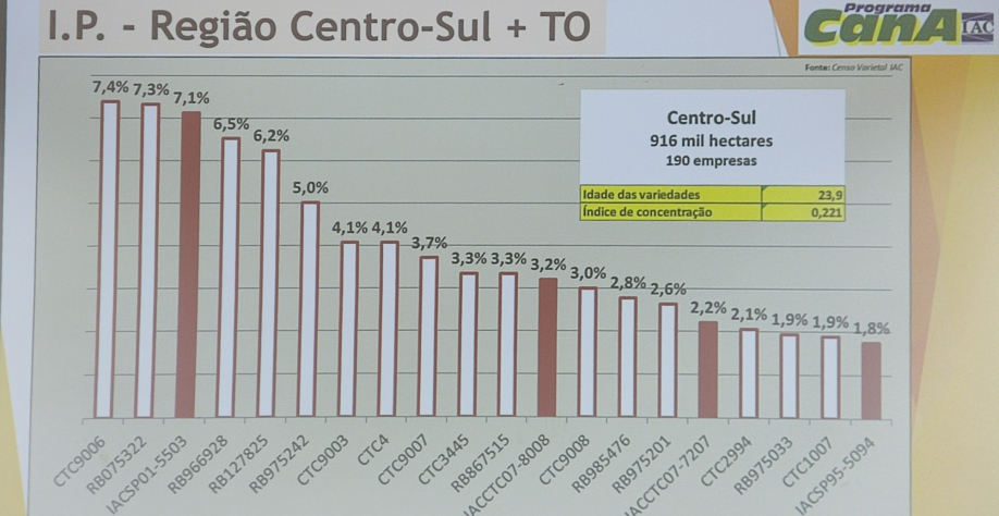 No Centro-Sul, as três primeiras colocadas possuem índices bastante semelhantes: CTC9006 (7,4%), RB075322 (7,3%) e IACSP01-5503 (7,1%). No Norte-Nordeste a situação é bem diferente. A RB08791 se encontra na liderança isolada, com 29,1% de intenção. Na segunda e terceira colocação, aparecem a RB92579 (13,7%) e RB127825 (6,2%).