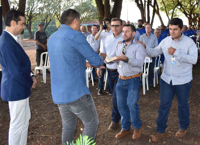 Após a abertura da cerimônia religiosa pelo pastor e o padre e as orações, os colaboradores Gilson Moura, Juliano Fadoni e Rodrigo Luziano fizeram a entrega da Bíblia Sagrada e foram abençoados pelos celebrantes.