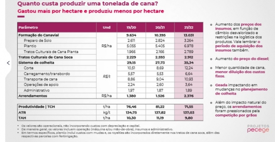 No evento Expedição Custos Cana, realizado em 3 de março, João Rosa, o popular Botão, Coordenador de Projetos do Pecege, apresentou números da evolução dos custos de produção de cana na região Centro-Sul nas últimas três safras – 2019/20, 2020/21, 2021/22 – e adiantou o quanto os profissionais de custo do setor estão orçando o valor para formar um hectare de cana para o ciclo 2022/23.