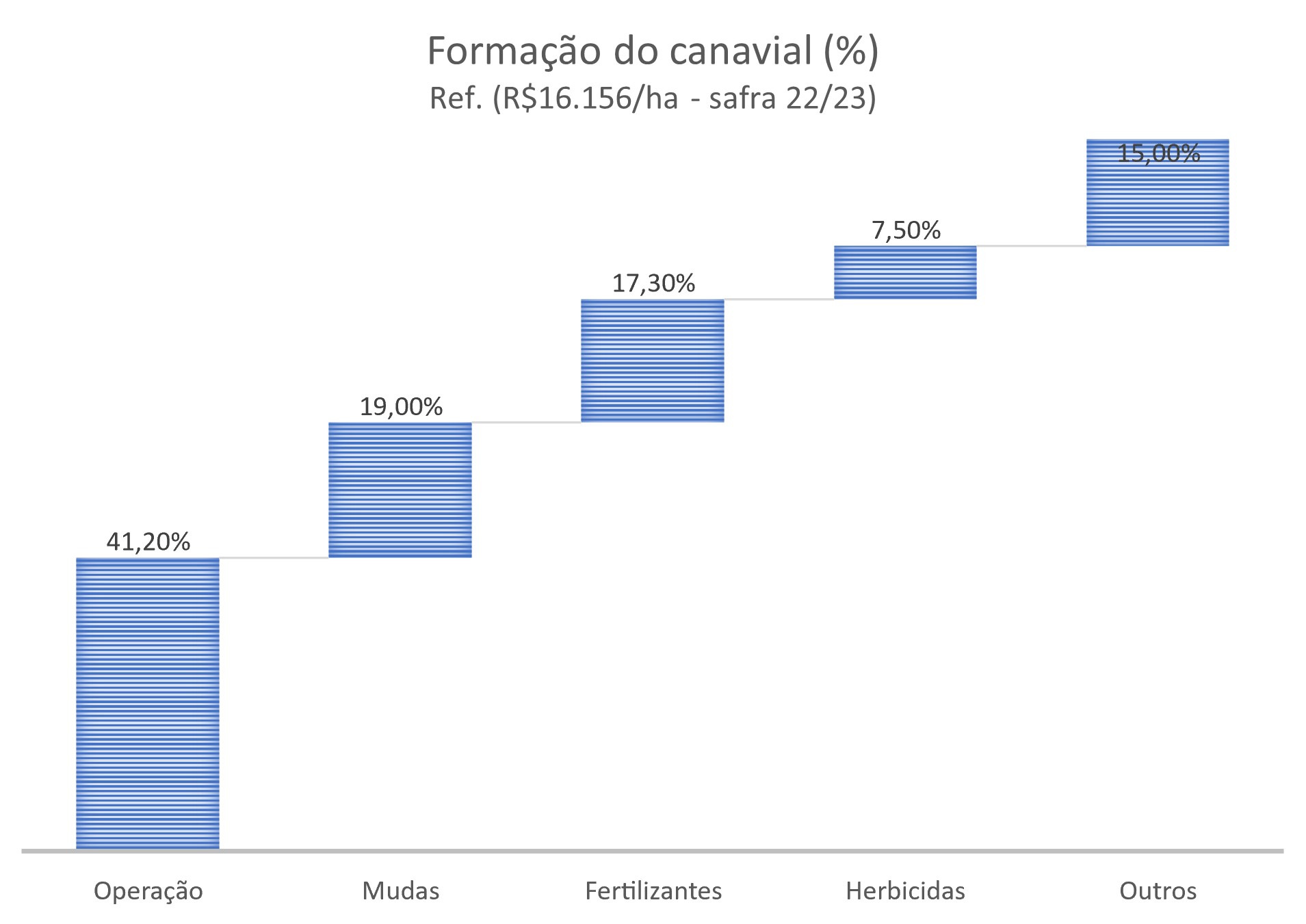 Interessante notar, conforme a figura abaixo, a representatividade de cada item que compõe a formação do canavial. Apenas três itens - operação (conjunto de operações com máquinas), mudas e fertilizantes - somam mais de 75% do custo relacionado à formação do canavial.