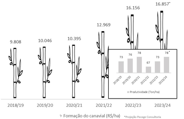 De acordo com a pesquisa de Benchmarking do Pecege Consultoria e Projetos, o custo relacionado à formação do canavial, incluindo os gastos com preparo de solo, plantio com mudas e tratos culturais (cana-planta), apresentou um aumento significativo ao longo dos anos. Na safra 2018/19 esse custo médio era de R$9.808 por hectare, mas estima-se que na safra 23/24 esse valor salte para R$16.857 por hectare. Diversos fatores contribuem para esse aumento, tais como a expressiva alta no preço dos insumos, a elevação do preço do ATR, os gastos adicionais com mão-de-obra decorrentes dos reajustes salariais, dentre outros.
