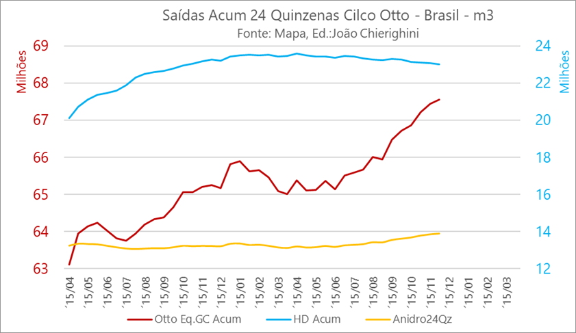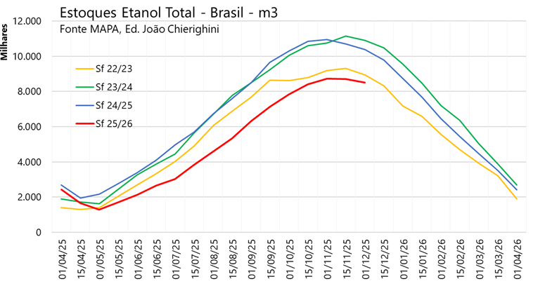 A combinação de produção já em patamar conhecido de limitação pela cana e incremento pelo milho, e a demanda se ajustando lentamente, com perspectiva de aprofundar a queda nas próximas semanas, resulta em uma curva de estoques que se aproxima de uma tendência de normalidade, diminuindo o risco de uma movimentação mais aguda de preços e dificuldades de logística de abastecimento no final da entressafra da cana, em abril/26.