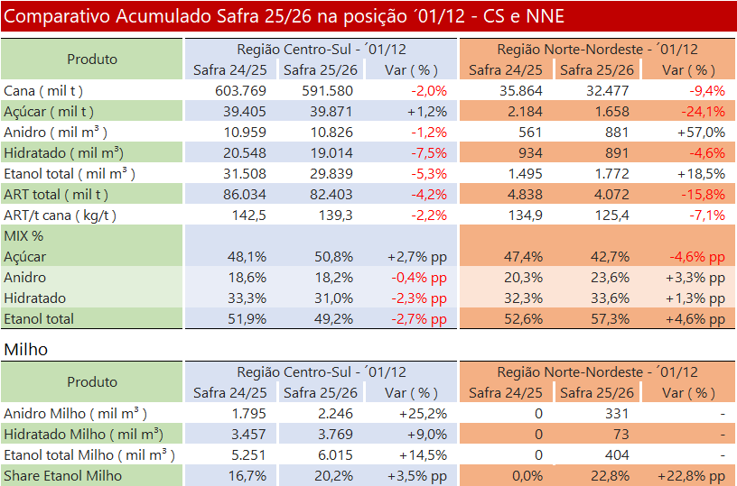 Produção Centro-Sul - A moagem acumulada na posição 01/12/25 no CS de 591.580 mil tons de cana representa queda de -2,0% e a qualidade está em 139,29 Kg atr/tc (-2,2%), que levam a queda de oferta em -4,2% no ATR total da região. Com MIX Sugar em 50,8%, +2,7pp% superior ao da mesma posição no ano passado, a oferta de etanol da região ficou 5,3% inferior à mesma posição no ano passado, 1,67 milhões de m3 a menos, já incluído o etanol de milho.