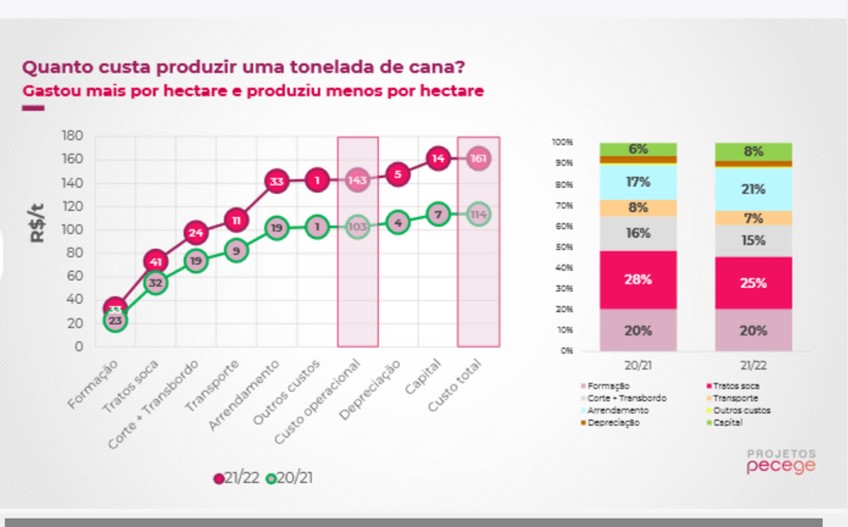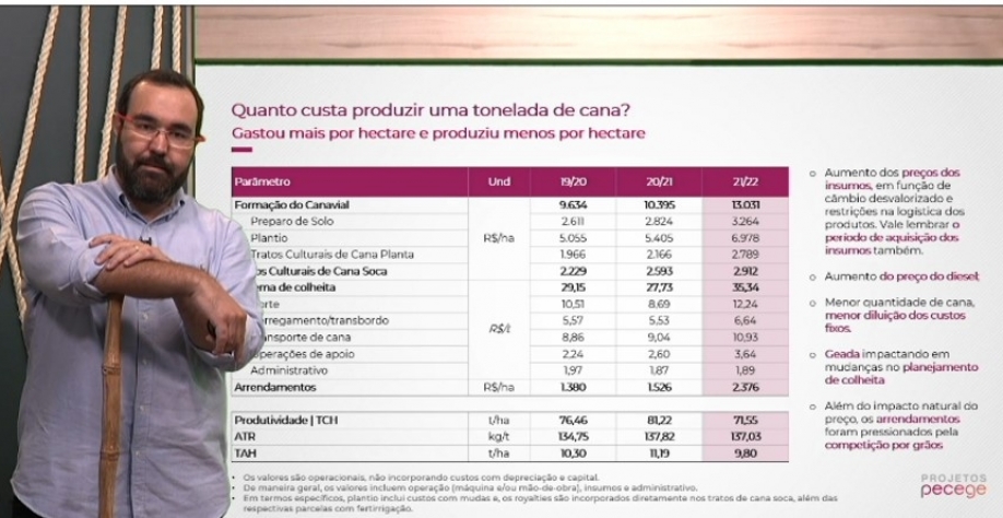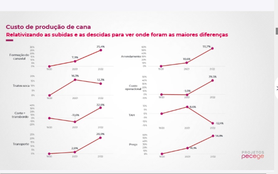 “Imagina a sua frente preparada para colher em uma área e de uma hora para outra é preciso realocar a frente para um canavial a quilômetros de distância. Essas mudanças elevarão o custo com estrutura de apoio, que foi de R$ 2,50 por hectare na safra 2020/21 para R$ 3,64 na safra 2021/22”, observou Botão.