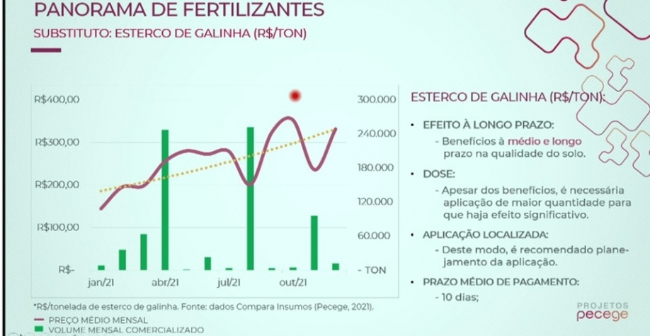 No entanto, com o aumento da demanda, o preço do esterco de galinha vem aumentando. De acordo com pesquisa do Pecege, a tonelada desse esterco, saiu de 100 reais em julho de 2021 e fechou 21 a quase 300 reais a tonelada.