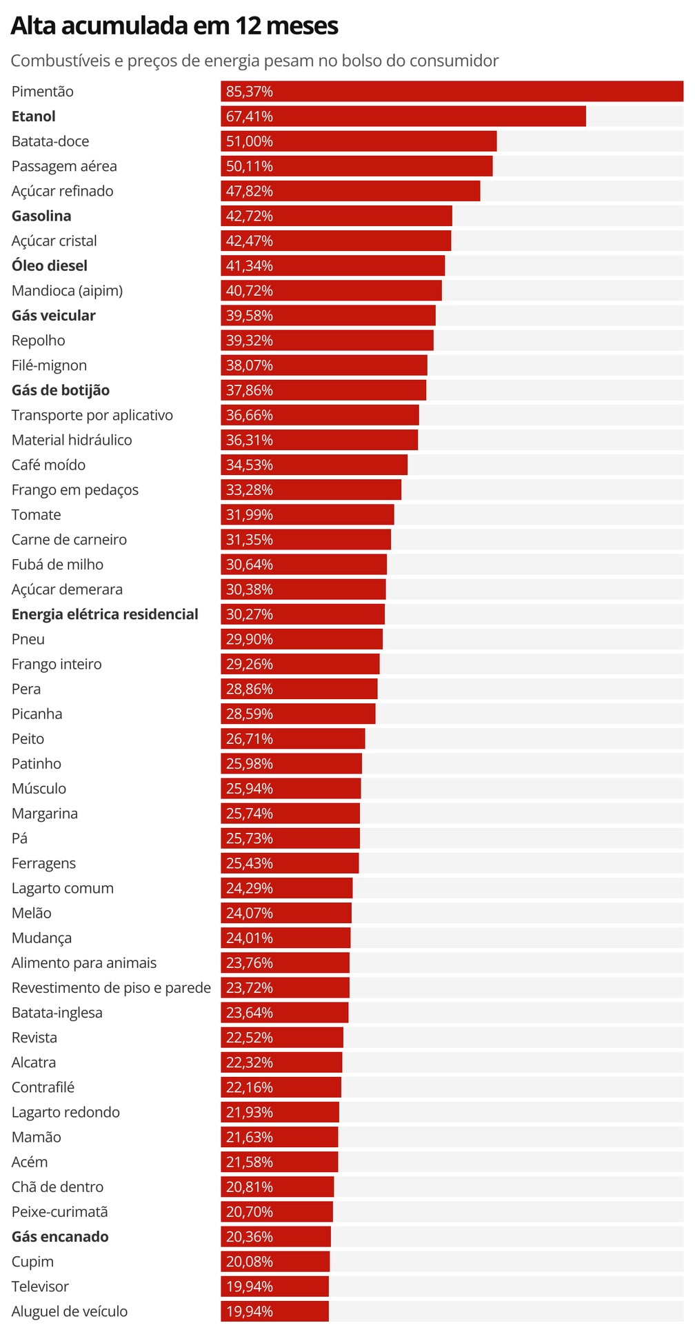 Os principais vilões da alta – sem nenhuma surpresa – foram os combustíveis, que subiram, todos eles, mais de 40%. No caso do etanol, a alta chegou a quase 70%.