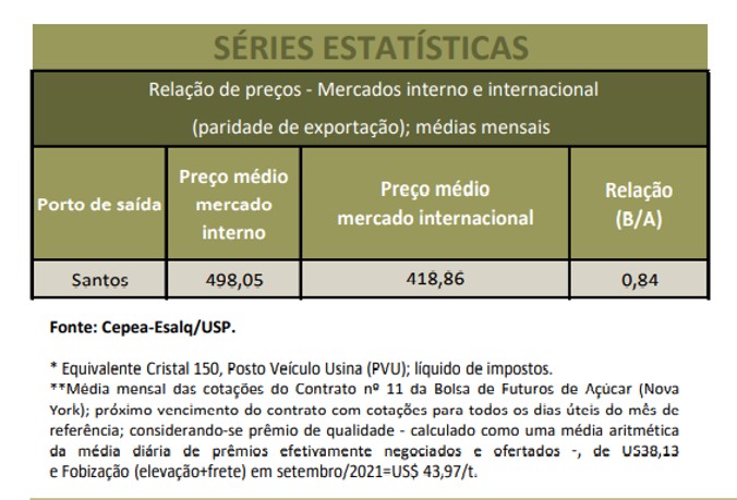 Segundo a Unica (União da Indústria de Cana-de-Açúcar), a quantidade de cana-de-açúcar processada pelas unidades produtoras do CentroSul somou 38,38 milhões de toneladas na primeira metade de setembro, queda de 14,09% sobre o volume da mesma quinzena da safra anterior (2020/21). Na parcial da atual temporada 2021/22 (de abril/21 a primeira metade de setembro/21), a moagem acumula diminuição de 6,62% frente a igual período do ciclo anterior. Na primeira metade de setembro, a produção de açúcar somou 2,55 milhões de toneladas, queda de 20,48% frente à igual período do ano passado. No acumulado da atual safra, a produção de açúcar foi de 26,83 milhões de toneladas, abaixo das 29,19 milhões de toneladas em igual período do ciclo 2020/2021.