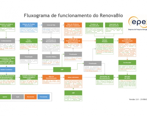 Visando contribuir para o sucesso do RenovaBio, importante iniciativa governamental que almeja expandir a produção de biocombustíveis, fundamentada na previsibilidade e sustentabilidade ambiental, econômica e social, a Área de Biocombustíveis da Diretoria de Estudos do Petróleo, Gás e Biocombustíveis da EPE desenvolveu um fluxograma explicativo da estrutura de funcionamento.