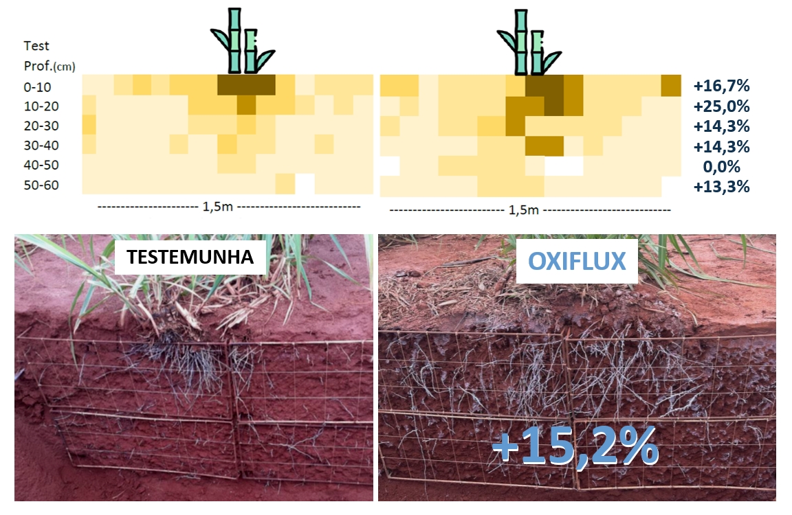 Além dos ganhos em produtividade, o estudo também demonstrou incremento de 2,4 toneladas de açúcar por hectare (TAH) em comparação ao melhor concorrente, o que representa um aumento de 15%. A pesquisa também avaliou o sistema radicular em diferentes profundidades, constatando que, até 60 centímetros, houve um crescimento adicional de 15,2% nas raízes em relação ao tratamento testemunha. Esse fator é essencial para que o canavial explore melhor os nutrientes e a água disponíveis no solo, conferindo maior resistência a períodos de estiagem e adversidades climáticas.