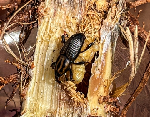 - Destruição da parte interna dos perfilhos: as larvas se instalam na região do rizoma, constroem galerias e matam os perfilhos das plantas, diminuindo a produtividade do canavial.