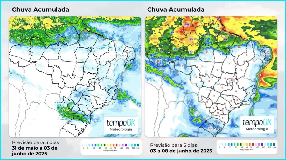 Nas regiões Sudeste e Centro-Oeste, o cenário é diferente: são previstas chuvas próximas ou abaixo da média, especialmente em áreas como Goiás, Distrito Federal e o norte de Minas Gerais, onde o tempo seco tende a se intensificar nas próximas semanas.